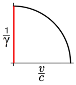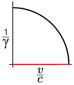 The horizontal axis is in terms of v/c — the velocity divided by light speed. Since c is the maximum possible velocity, v/c varies from zero (vertical red line) to one (horizontal red line).