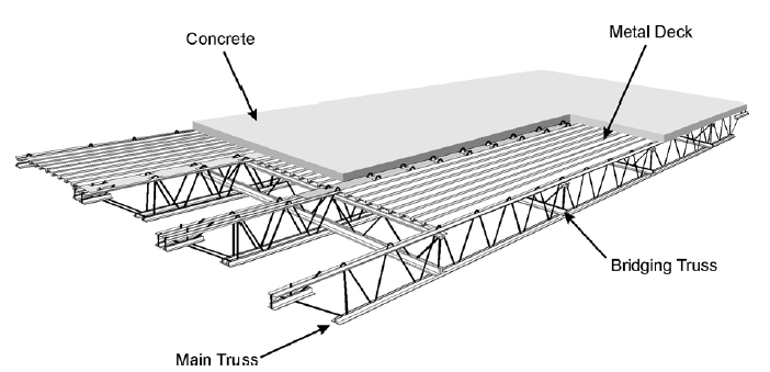 Each floor consisted of a set of horizontal beams. Heavy long beams (60 or 35 feet) hung between the inner core and the outer wall. Shorter bridging trusses hung between the long beams to provide support and rigidity. As in all such buildings, corrugated sheet steel lay atop the beams with a 4-inch concrete floor poured over. This design allowed the entire floor to be open, with no vertical beams. The only obstruction was the central core.