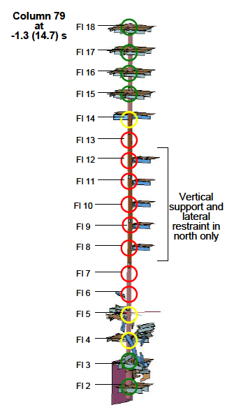 The building’s design used the horizontal beams to hold the vertical beams in place. Without that support, the vertical beam buckled from the building load. This caused WTC7 to collapse inwards.
