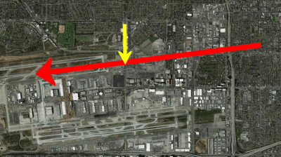The large building (with black windows and white grid work) directly below the 747 is nearly directly east of the north runway where I think the plane landed. I’m guessing, but the Google Earth snap below shows what I believe is the 747’s landing path (red arrow) and the photographer’s angle (yellow arrow):