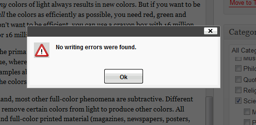 Abso! I always get a little rush when I click the spell-check button and that little dialog pops up! (Only counts the first time you spell check a new post.) It doesn’t happen often, especially since I’m prone to creativity with English, but when it does it makes me happy.