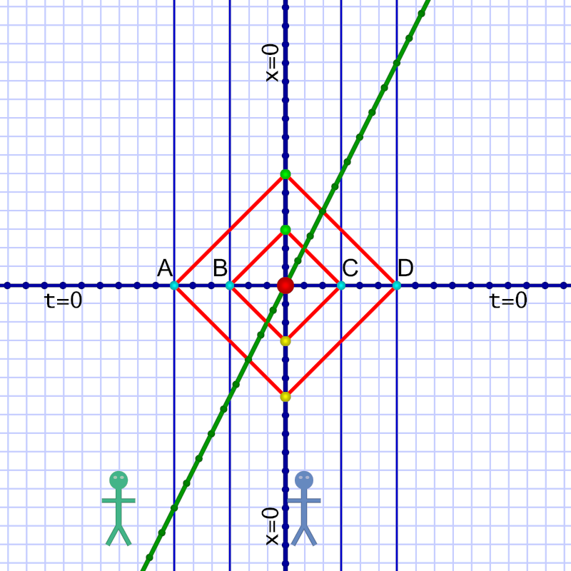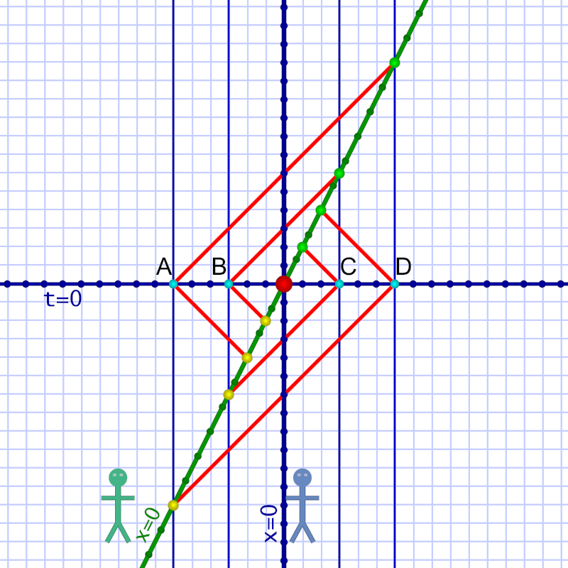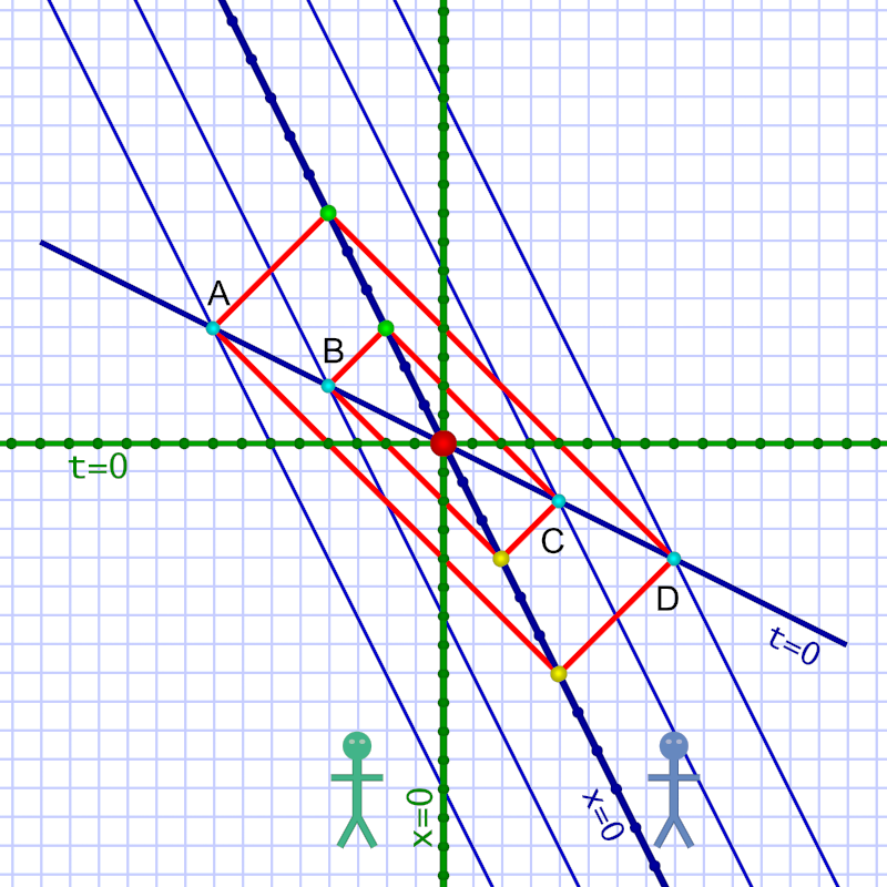 In the diagrams that follow, lines in Al’s frame of reference are blue; lines in Em’s are green. (Click on any of the diagrams below for a large version.)