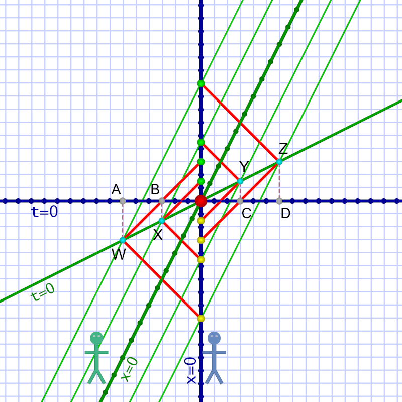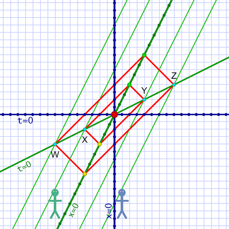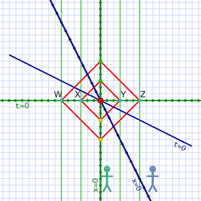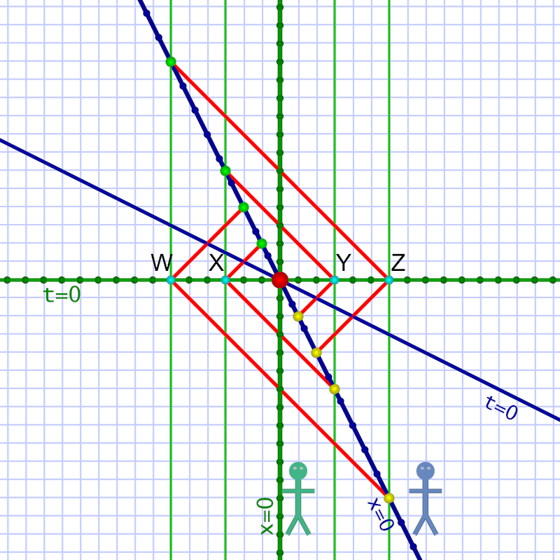 ¶ Em (diagram 2) thinks she’s standing still. She sees different events W, X, Y, & Z, as simultaneous and defines her t=0 as the moment when they occur. (And her own world line — vertical green line in center — is x=0.)