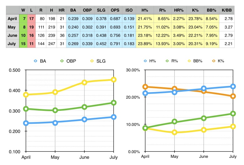 Pretty nice month of July! An actual run surplus and close to .800 OPS (and, sure enough, the Twins played .577 ball that month).
