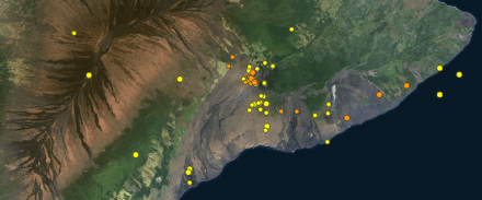 At USGS Earthquakes you can make custom views of “eq” events! Kilauea is the cluster of orange dots in center. Pu‘u O‘o is to the east and is emitting a column of smoke. Fissure 8 is in upper right corner (not visible in this satellite photo). Mauna Loa is to the left.