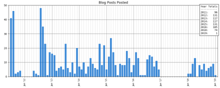Seems my best year so far was 2015. As shown next, I did post a bit more that year. Of course, 2016 the world got weird, so maybe it has nothing to do with me.