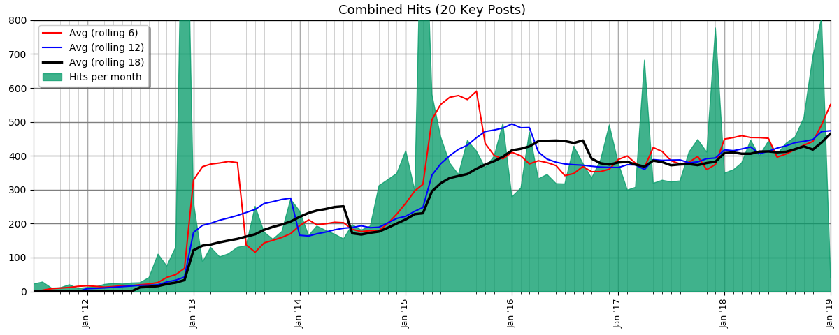 These are page hits for the twenty posts I started tracking back in 2016 (some of which date back to the earliest days). The chart shows the entire life of the blog (since July 4, 2011).I designed it to be pretty more than useful (that’s okay with charts). I thought it was fun to see the rare spikes (the first two due to being “Freshly Pressed”) and general trends.