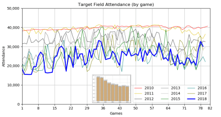 Target Field attendance has declined every year except for a tiny bump in 2017 (due to better team performance). It does seem to have bottomed out in the last three years.