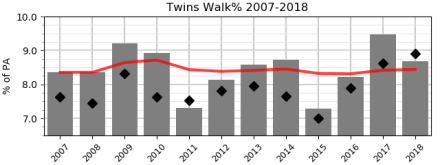 As I mentioned above, the Twins have been good about walks, both taking them and not giving them away. They’re pretty consistently below MLB average, although 2018 had a lot of walking!