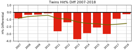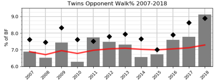 Big problems getting strikeouts starting in 2011, but a recent rising trend. In 2018 they were at MLB average — a hopeful sign. I certainly enjoyed seeing the strikeouts from Twins pitchers last year!