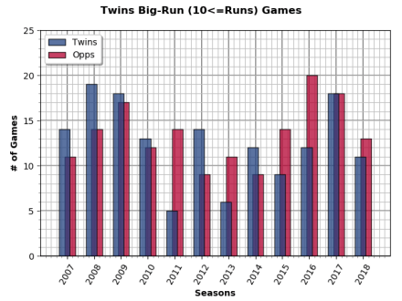 The chart above shows number of “big” games per year (by the Twins and their opponents). A “big” game is when the team scores ten or more runs.