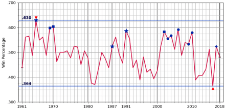 Minnesota Twins win percentage each year of the franchise. Stars mark years the Twins went to the World Series (1965, 1987, 1991). Boxes show when they went to Championship Series (1969, 1970), Dots the Division Series (five times in the 2000s), and the one Cross in 2017 the Wildcard.