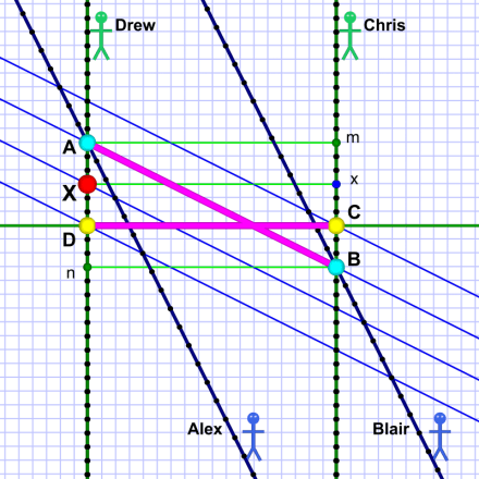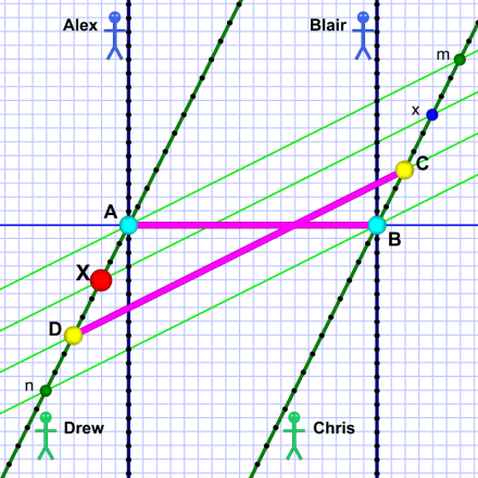 The moment Drew passes Alex is simultaneous with Chris’ point m, while the point Chris passes Blair is simultaneous with Drew’s point n. From their point of view, Chris passes Blair three green time slices before Drew passes Alex.