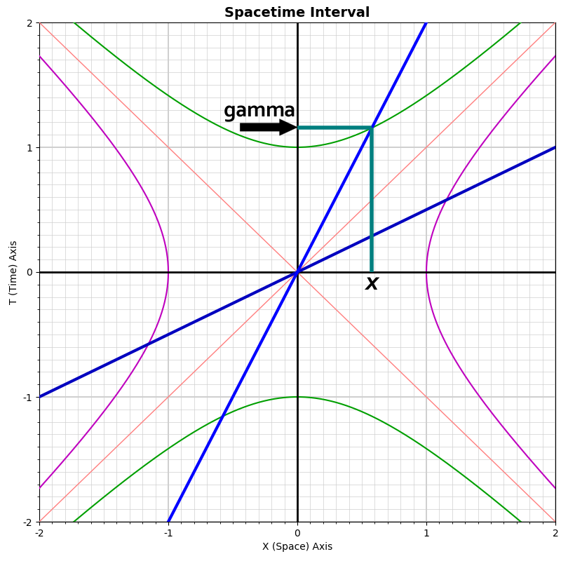 One thing I didn’t mention is that the dot markers on the very top diagram, my canonical “Special Relativity image,” are the points where the hyperbolae intersect with a given axis.