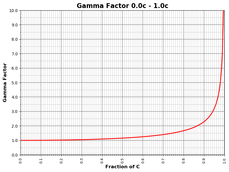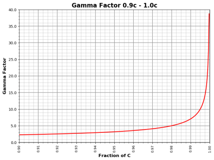 This chart zooms in on the 0.9c to 1.0c range where things start to really pick up. But notice how similar it is to the full curve and how, even in this range, it’s not until 0.98c that things really pick up.
