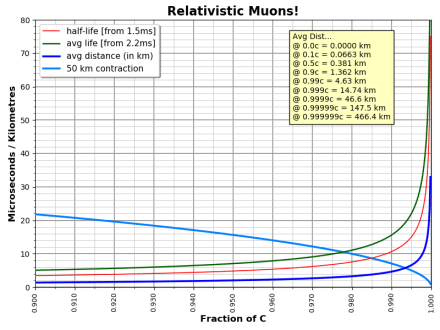 Firstly, the chart covers the range from 0.9c to 1.0c. The vertical scale is both micro-seconds and kilometers. I’ve adjusted things so the numbers are correct for both scales.