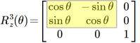 The name, R2z, means that it is a two-dimensional rotation matrix rotating on the z axis. The template is a function; it takes an angle, θ (theta) and returns a matrix of actual values.