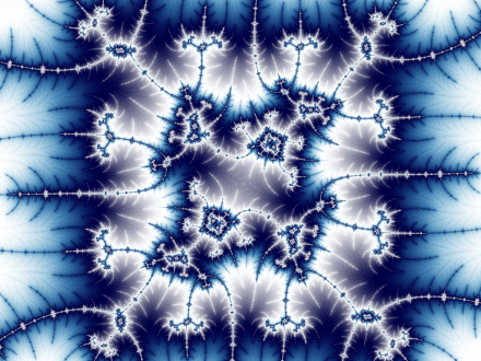 The image above (a “Mandelbrot Doily”) shows that chaos beautifully. This one is from the region in the “valley” between the main cardioid and the biggest bulb directly “west” of the cardioid.