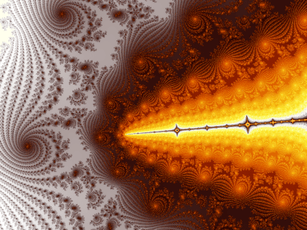 In other regions of the M-set, things are more complicated. The image above shows the needle of a satellite deep in the region to the “lower left” of the main Mandelbrot.