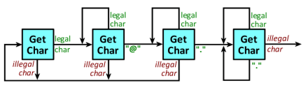 For example, a simple FSA that validates the format of email addresses can be seen as taking (single) characters as inputs and having states labeled with (single) numbers.