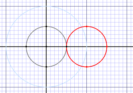 Cardioid curve (red), unit circle (blue), and half-sized circle (gray).