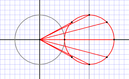 What makes it a little interesting is that, while the points on the centered half-size circle (gray) have the angles just described, since the reflected circle (red) is no longer centered, the angle to its points is different: