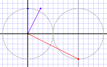 Now a slightly harder one, the “12 o’clock” point on the first circle matches the “6 o’clock” point on the second. The first point has an angle of 90° and the other (from the origin to the bottom of the red circle) has an angle of just over -26° and a magnitude just under 1.12.