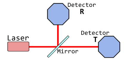 Consider a simple experiment where a laser emits a single photon towards a half-silvered mirror. The photon has a 50% chance of being reflected and then hitting detector R (reflected) and a 50% chance of passing straight through and hitting detector T (through).