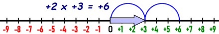 We start with +3 out on the number line. That gives us our jump distance. We want to multiply it by +2, which is positive, so we make two jumps in the same direction. The answer is +6.