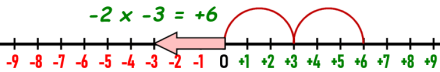 We start in the negative direction with -3, but the -2 makes us jump in the opposite direction, so the answer is +6. The same thing happens if we start with -2 and then, because minus 3, jump three times in the opposite direction: +6.