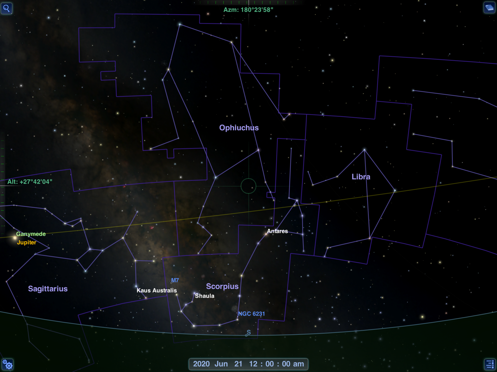 Notice how the Milky Way galaxy descends from the upper left corner down towards the bottom center. (Few will be able to see it with the naked eye due to light pollution.) See how it passes between Sagittarius and Scorpius? That point between them is the heart of our galaxy.
