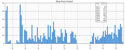 No posts in all of 2017. Interesting pattern in first 16 months: Firstly, five on, five off, six on. Secondly, the big spikes in both on periods. I obviously wasn’t pacing myself.