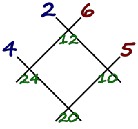 Then we combine matching corners. That can get a little tricky if the two factors have a different number of digits, but when both numbers have the same count of digits, the resulting diamond shape is simple.