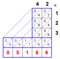 As with the Japanese visual method, the focus is the grid created by the Cartesian product of the multiplicands, which are written along two edges of the grid.