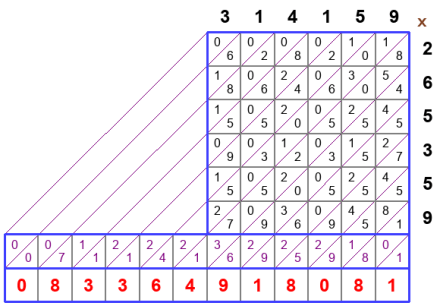 That said, if one actually does have to do a multiplication by hand, it’s usually quickest and simplest just to use the old-fashioned long-hand method, although some version of the lattice method, once practiced, isn’t bad.