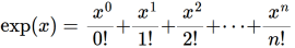 The formal definition of the exp(x) function reflects this transcendental nature. In principle, it’s an infinite series of terms. In reality, we use enough terms to give us the precision we need for a given task.
