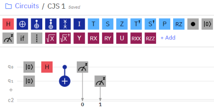 I’ll post about this in detail as I get more into it, but very briefly, from left to right, two qubits (q0 and q1) are initialized to |0〉, then q0 is put in superposition (|0〉+|1〉) and entangled with q1. Finally both qubits are measured.