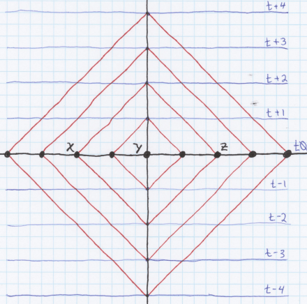 Figure 1. Our frame of reference. We define when distant events occurred by how long it takes their light to reach us. In particular, we can only say all the events shown (the black dots) happened (simultaneously) at t0 after their light reaches us. (Note the three events labeled X, Y, and Z. These are referred to below.)
