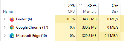 This article in Tom’s Guide is about the memory consumption between Edge, Chrome, and FireFox. It found similar results — all three are roughly the same, but FireFox consistently uses more memory and Edge uses less.