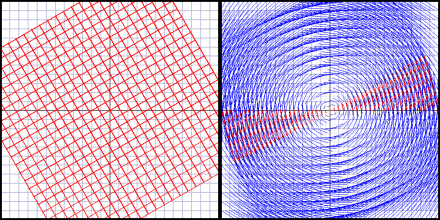 The blue lines show the movement of selected points under the transform. (Points on the X-axis are red.) The blue lines are not vectors, but the movement of the tips of vectors. For instance, under this transform, all the tips move inwards as their vectors shrink to half their original length.