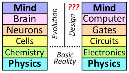 For instance, Chemistry depends on Physics — so does Electronics. In turn, Cells and Circuits depend on the levels below them, and likewise Neurons and (logic) Gates. Finally we have the complete systems of Brain and Computer.