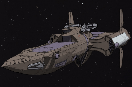 Spike’s one-person spaceship, Swordfish II. (Note orbiting Moon rock.)