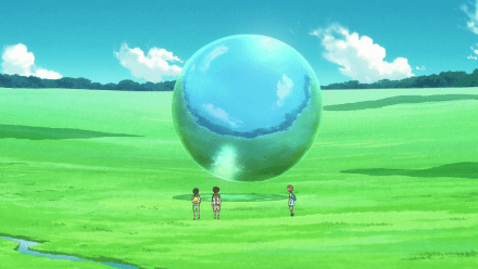 Following the penguin trail through the forest, Aoyama and Uchida encounter a vast open meadow, and — very much to their surprise — find classmate Hamamoto investigating her own mystery, a giant sphere of water hovering a few feet above the meadow. She refers to it as the “ocean.”