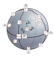 In the Poincaré sphere, the three pairs of polarization basis states form the three axes. The |L〉 & |R〉 circular states form the vertical axes. The |H〉 & |V〉 linear states form one horizontal axis; the |D〉 & |A〉 linear states form the other.