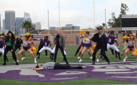 Musical number over a dead body. CSI Ella Lopez (far left), Det. Decker (center), Lucifer (middle right).