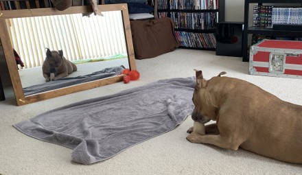 We had a room in a house (work-out room) with one wall all mirrors (not our doing). Our Labrador would freak when we both went into it. She’d see me /there/ and see me /here/ and back and forth and start barking at the both of us. She never did get used to it.