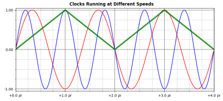 Figure 3. Two waves (red and blue) from two clocks with different frequencies. They are in phase only momentarily at 0.0, +2.0, and +4.0 pi radians. They are (again momentarily) exactly out of phase at +1.0 and +3.0 pi radians. The green line traces the phase difference from 0° to 180° (aka 1.0 pi radians). (Note the scale difference there.)