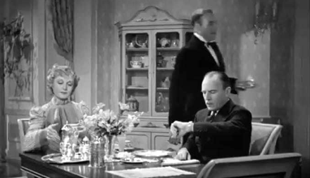 From the movie: Clara Topper (Billie Burke) and Cosmo Topper (Roland Young) sitting down to breakfast. Wilkins, the butler (Alan Mowbray), in the background.