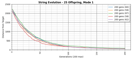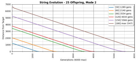 The Mode 2 linear evolution makes the halfway point string a mess of gibberish and not worth showing. The Mode 3 halfway point string looks similar to the Mode 1 one. This one happens to have a distance of only 30 (and after only 1433 generations), so while the long tail is still present, the overall time is less. (At least in this run.)