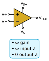 Bottom line, op amps are easy to understand. The inputs float, no current flows into them, and the output doesn’t get bogged down unless the circuit is really bad. Assume infinite gain and that’s pretty much the ballgame.